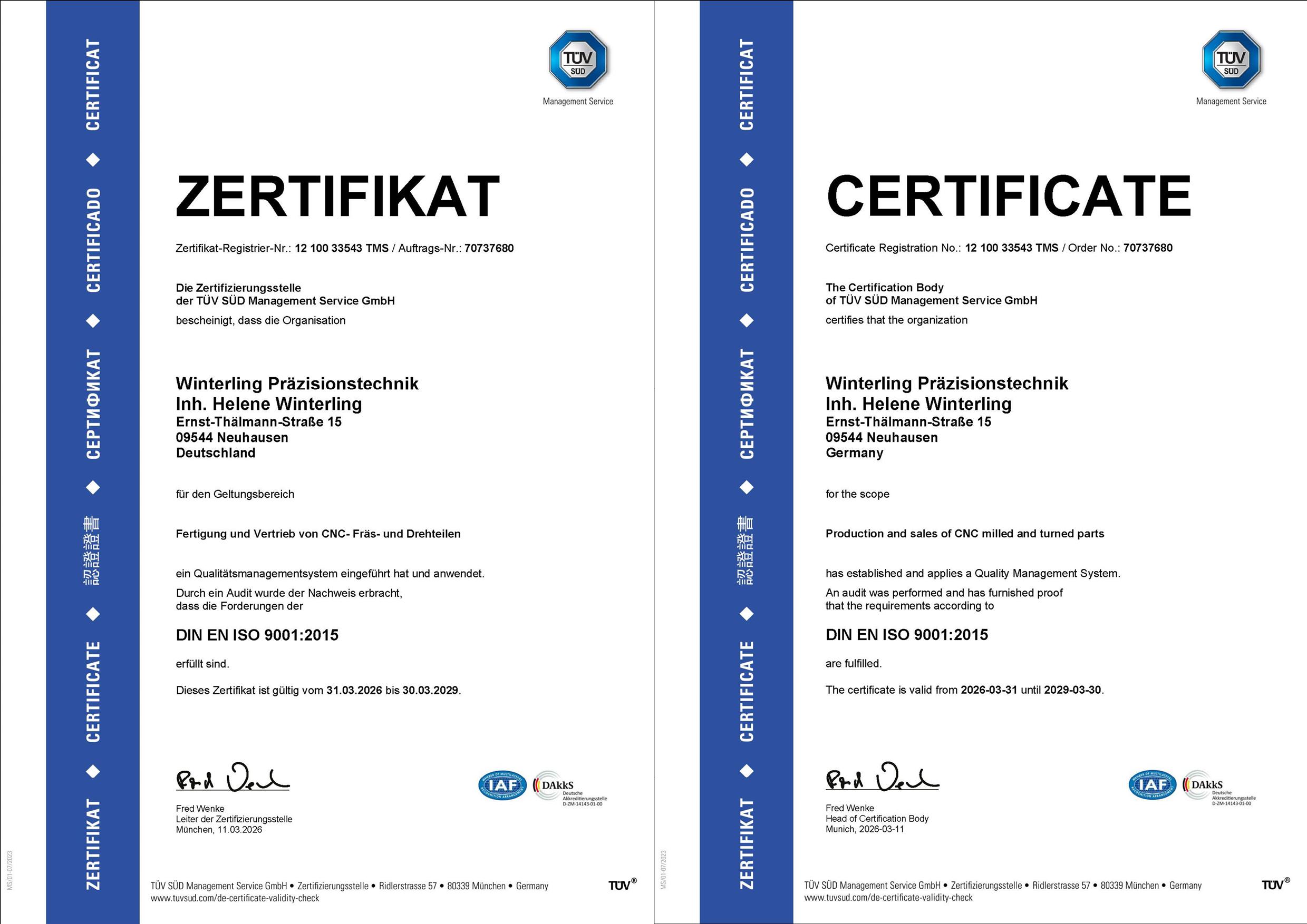 Als DIN EN ISO 9001:2015 zertifiziertes Unternehmen gehen die Optimierung sowie permanente Weiterentwicklung unserer Prozesse Hand in Hand mit unserer langjährigen Expertise in der industriellen Präzisionsfertigung. Eine sorgfältige Auswahl unserer Lieferanten und vertrauensvolle Beziehungen zu unseren langjährigen Kooperationspartnern stehen für eine ganzheitliche Qualitätssicherung.